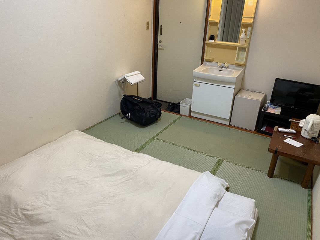 新伊勢崎駅から近く、安かったので泊まりました。まず予約時に喫煙ルームということを見ておらず、えっとなりました。これは私が悪いんですが。喫煙室だから安い料金だったので仕方ないです。部屋は畳敷きで、タバコの匂いは結構してました。エアコンは昭和の代物で、リモコンが有線です。黄ばみも凄かったです。私は別にどこでも寝れるので大丈夫でしたが、気になる人はかなり寝にくいと思います。近くにスーパーはないので、伊勢崎駅で買っておくのがいいかと思います。ドラックストアは近くにありました。