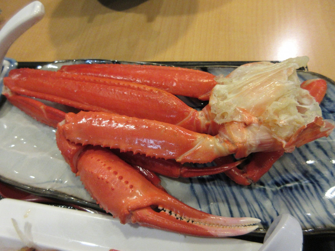 夕食はバイキングですが、カニの足食べ放題が付いていました。有料でないので、若干質がおちますが、カニを食べている感じはします。1 / 5