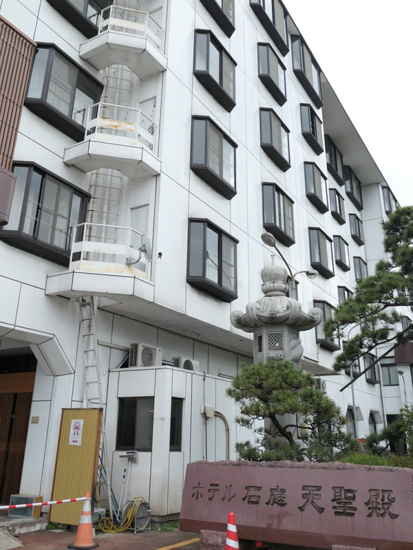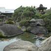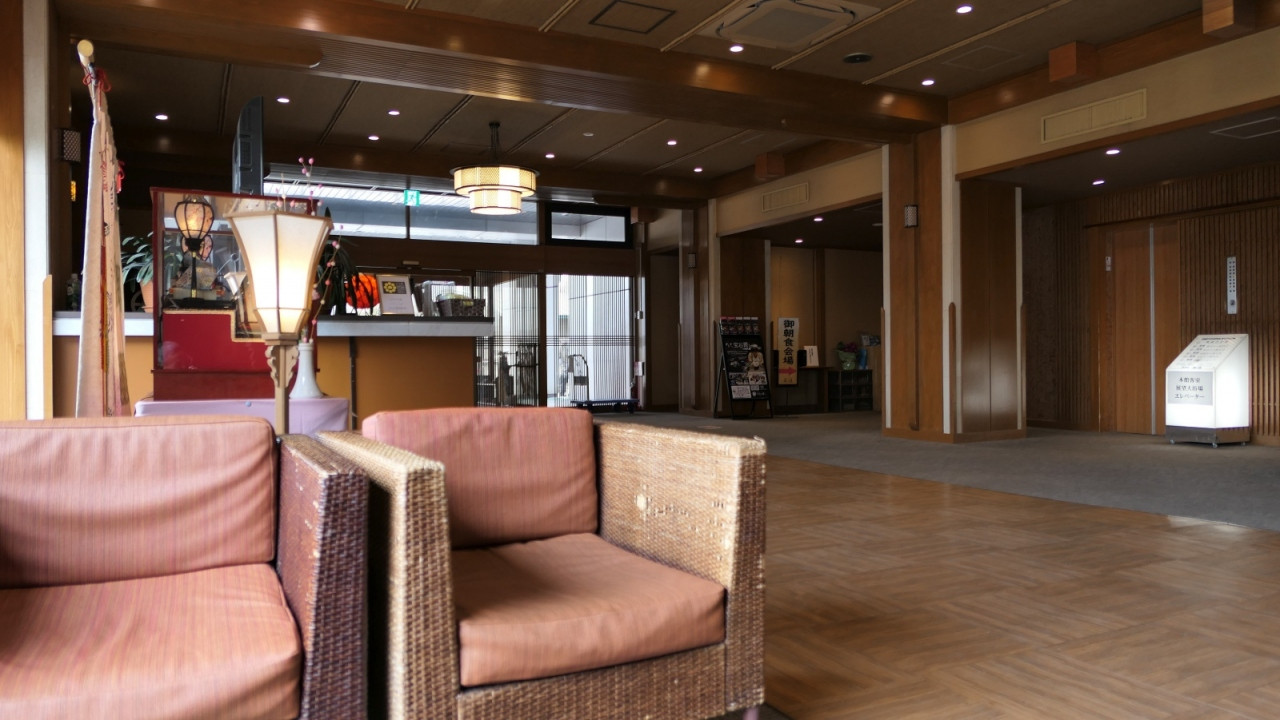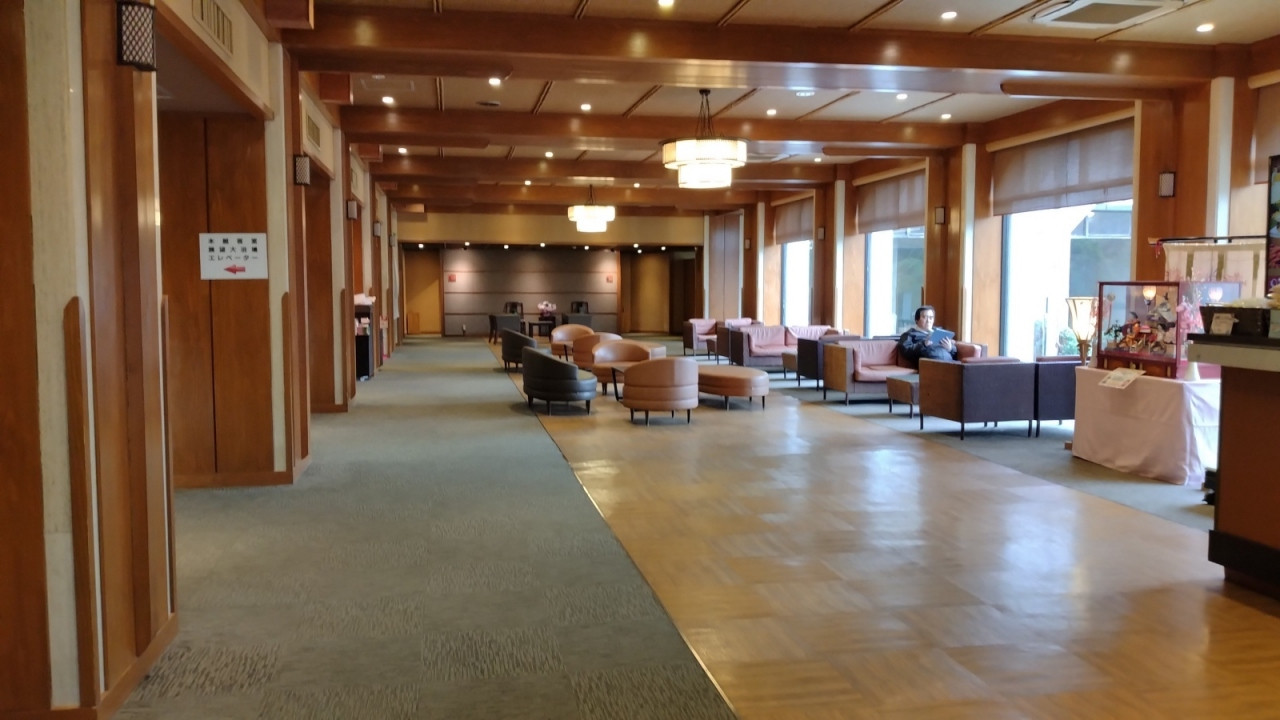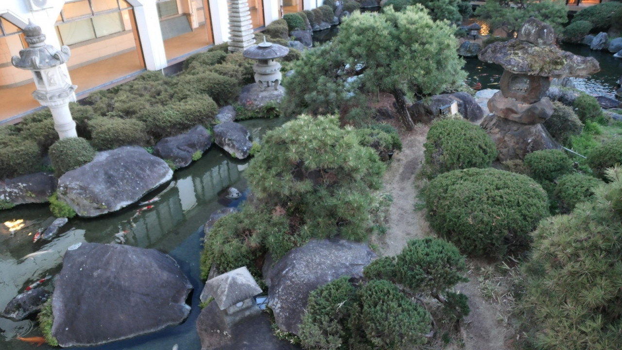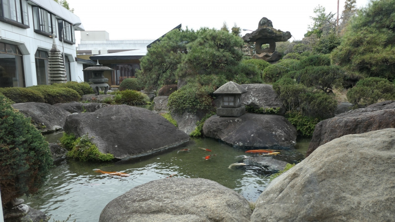 広いロビー、広い日本庭園に立派な錦鯉、多くの宴会場…どこかしら「昭和の団体客向け旅館」の風情ですが、悪くありません。