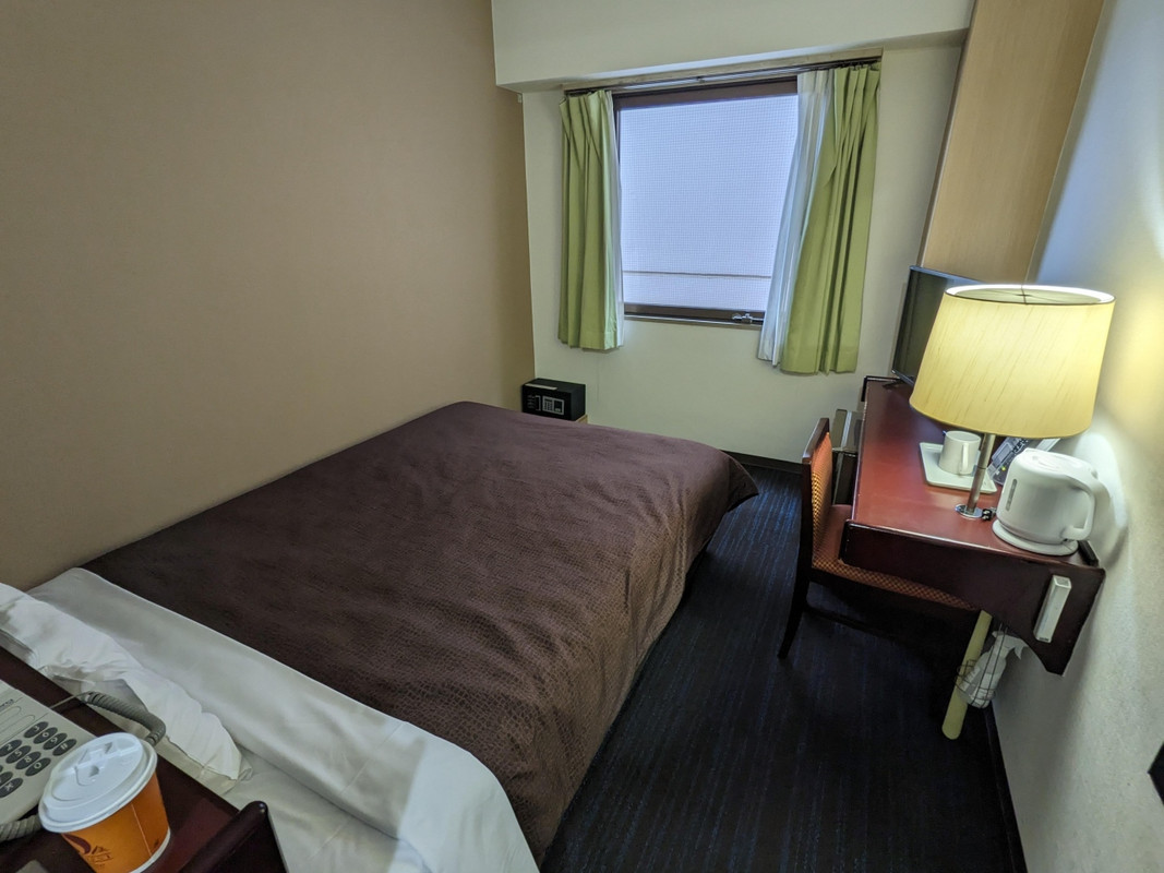 1泊6千円程度と安かったので宿泊しました。駅からは300〜400メートルぐらいは歩きます。ちょっと古めのホテルですが、泊まるだけなら十分でした。大浴場があるのが特徴です。パジャマは2ピースのもので快適でした。朝食は非常に簡素なものです。コーヒーの無料サービスがあります。