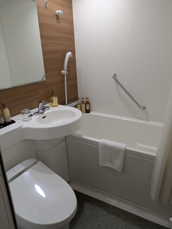 バスルームにPOLAのアメニティがクレンジング、洗顔フォーム、化粧水、乳液、ボディソープ・シャンプー、コンディショナーが備え付けでありました。
