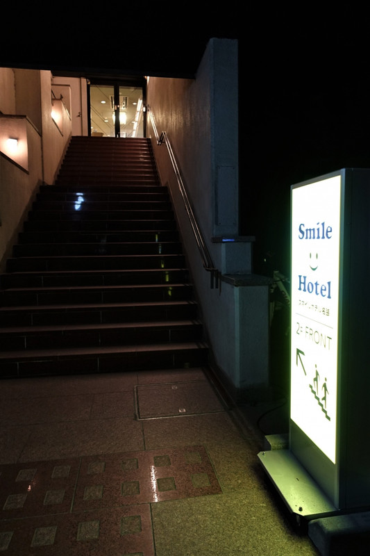 駅から1~2分の近さです。改札を出るとビルの上の方にスマイルホテルという文字が見えます。それで場所は判りますが、目の前まで行くと逆に暗くて見落としそうになりました。