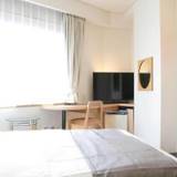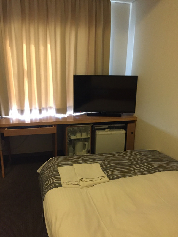 JR彦根駅西口から徒歩数分の好立地です。周辺にはショッピングセンター、飲食店などが多いので食事の心配はありません。チェックインは1階のカフェのようなところにあるカウンターで行いました。チェックアウトは2階です。部屋は十分な広さがあり上階なので佐和山城跡の方がきれいに見えました。ダブルベッドでしたが、やや柔らか目、寝る位置によってはマットのスプリングを感じます。難点は浴室の湯温調整が手動のところです。一々調整しないといけないので邪魔くさいです。朝食は2階でいただきましたが、小さな菓子パン4個、ヨーグルト、コーンフレーク(2種類あり牛乳加えました)、コーヒーゼリーにジュースでした。サラダがないのが残念です。