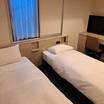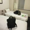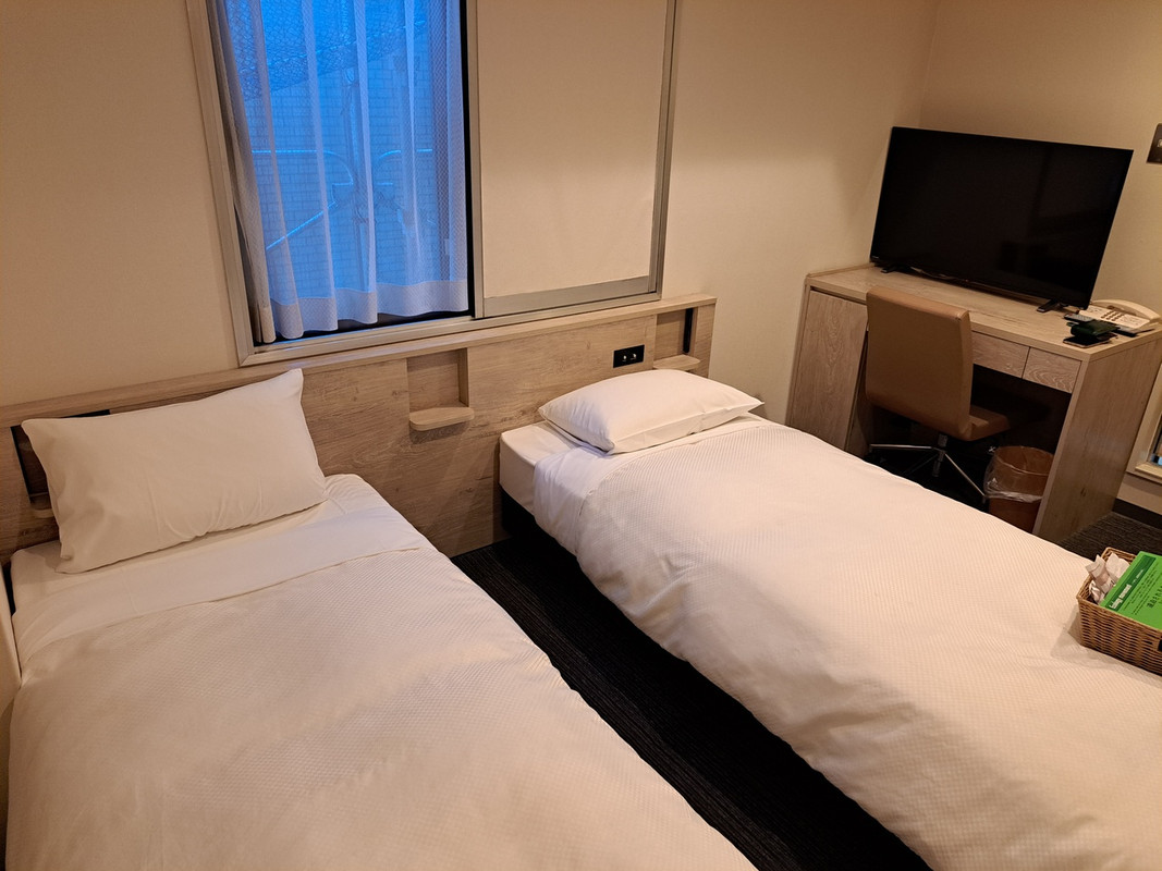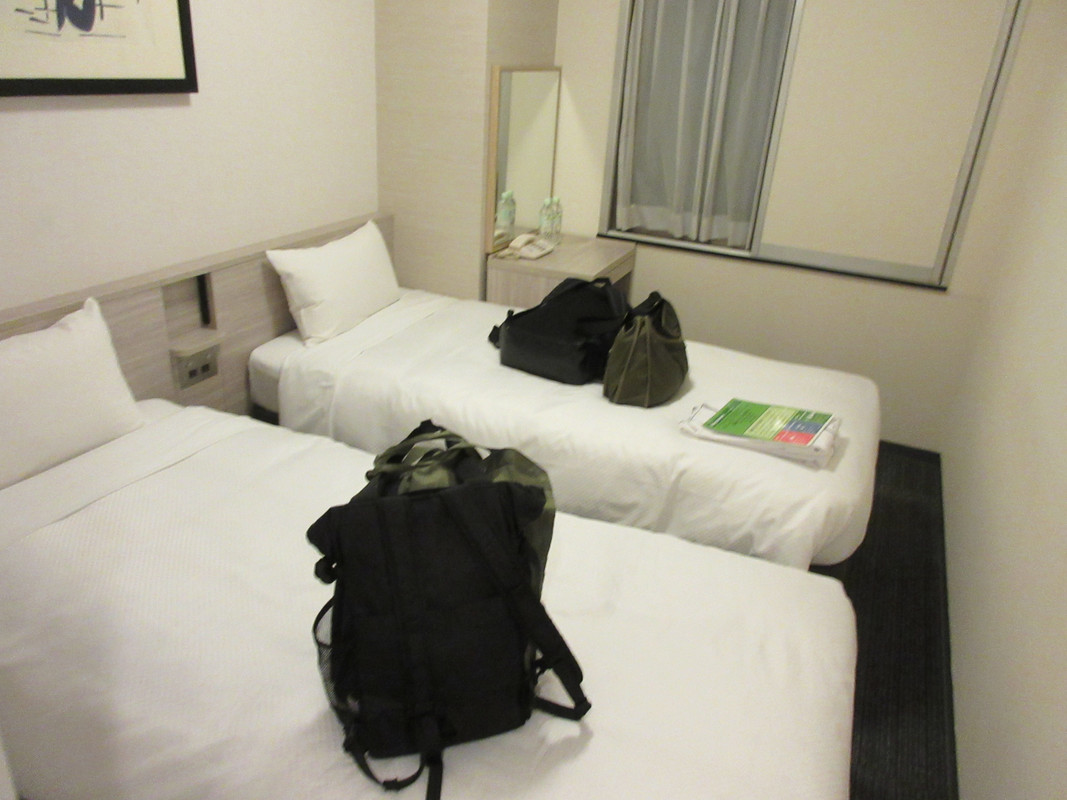 客室はツインルームを利用。入り口付近に冷蔵庫とポットがあり、その隣にユニットバス、奥にベッドとテーブルがありました。テーブルにはミネラルウォーターがありました。