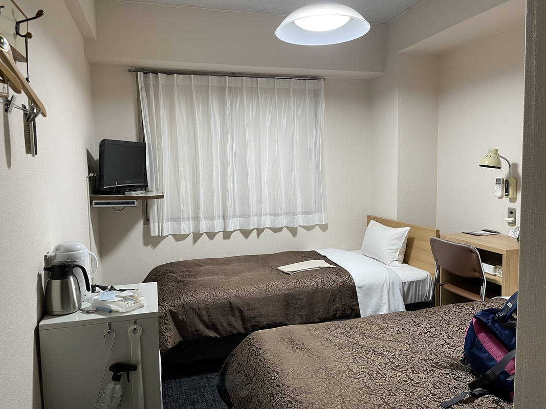 御堂筋線の江坂駅からすぐ、南側ホームからもホテルが見えます。今回の宿泊は古い別館です。フロントのある本館からは繋がっているので、雨に濡れることもありません。施設は古いですが、整備されています。当日はシングルでしたがツインのシングルユースに変更いただいておりました。ほかに道路挟んですぐ近くに2号館もありました。