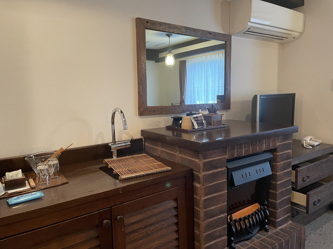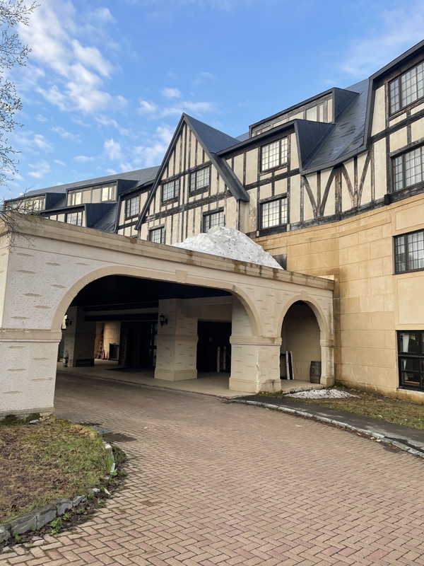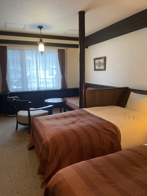 ホテル近くはまだ雪が残る季節でした。外装はすこしくたびれた感じでしたが お部屋の中は 木造の重厚感があふれる感じでした。