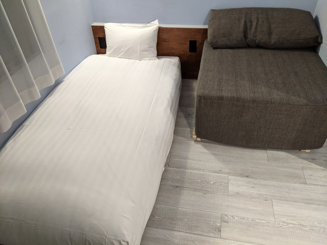 客室には小上がりがつき靴は脱ぎました。小さなソファ(折りたたみの簡易ベッドかと思いましたが)もあるのに低めのベッドで15㎡の部屋が広く感じます。浴室などところどころに古さは感じますがリフォームされているのか部屋そのものは平均レベルの清潔さ。四条通りがすぐにも関わらず静かに快適に過ごせました。