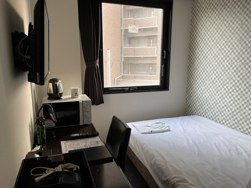 シングルルームに宿泊しました。ベッドサイズはセミダブルなので大きさは十分。部屋の広さはやや狭めですが、価格を考えるとそれも十分でした。リニューアルされていて、全体的には良いのですが、掃除はやや甘いところもあり、清潔感は・・・という印象です。バスルームも広さはそこそこでした。