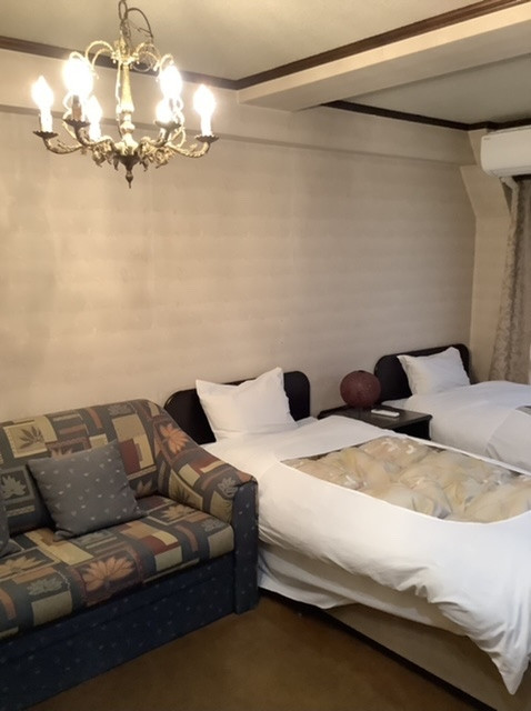 ツインのお部屋は和室を改装して無理やりユニットバスを入れたような作りで換気も悪く落ち着きませんでした。廊下の向こうはまだ改装中でずっと工事の音がしていました。