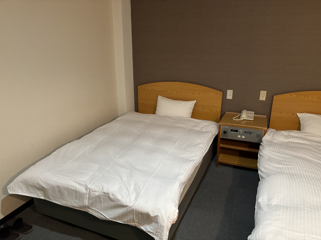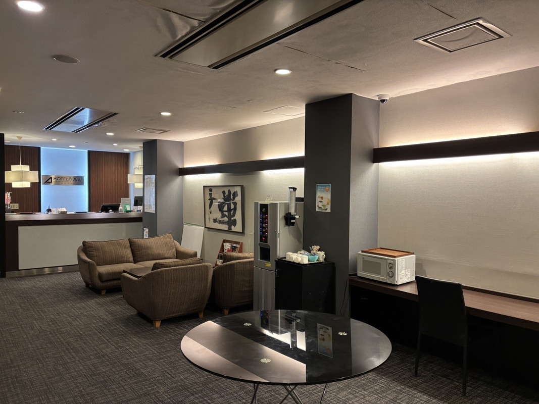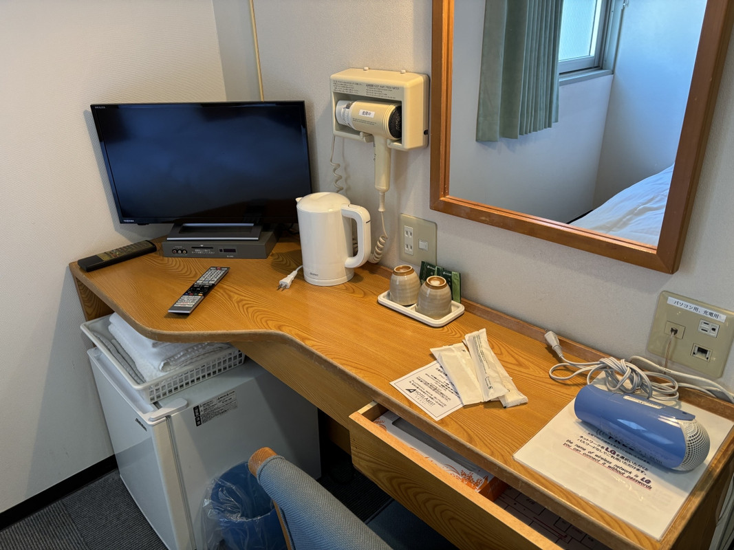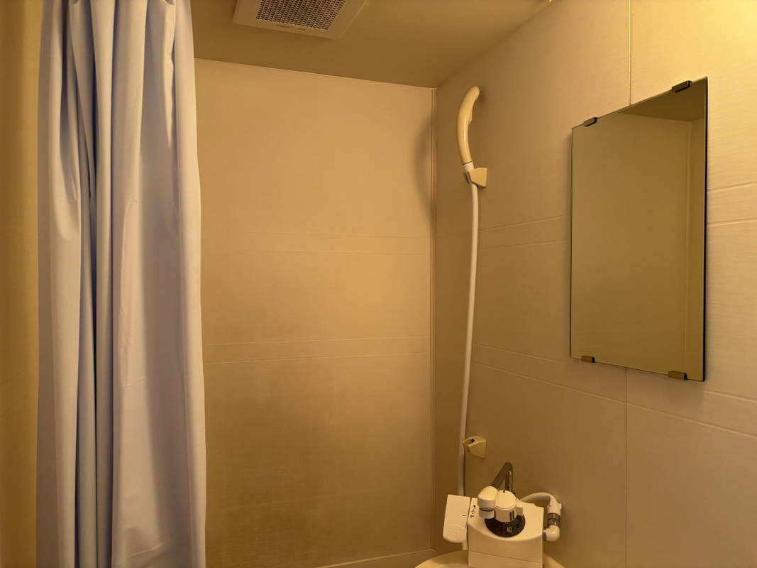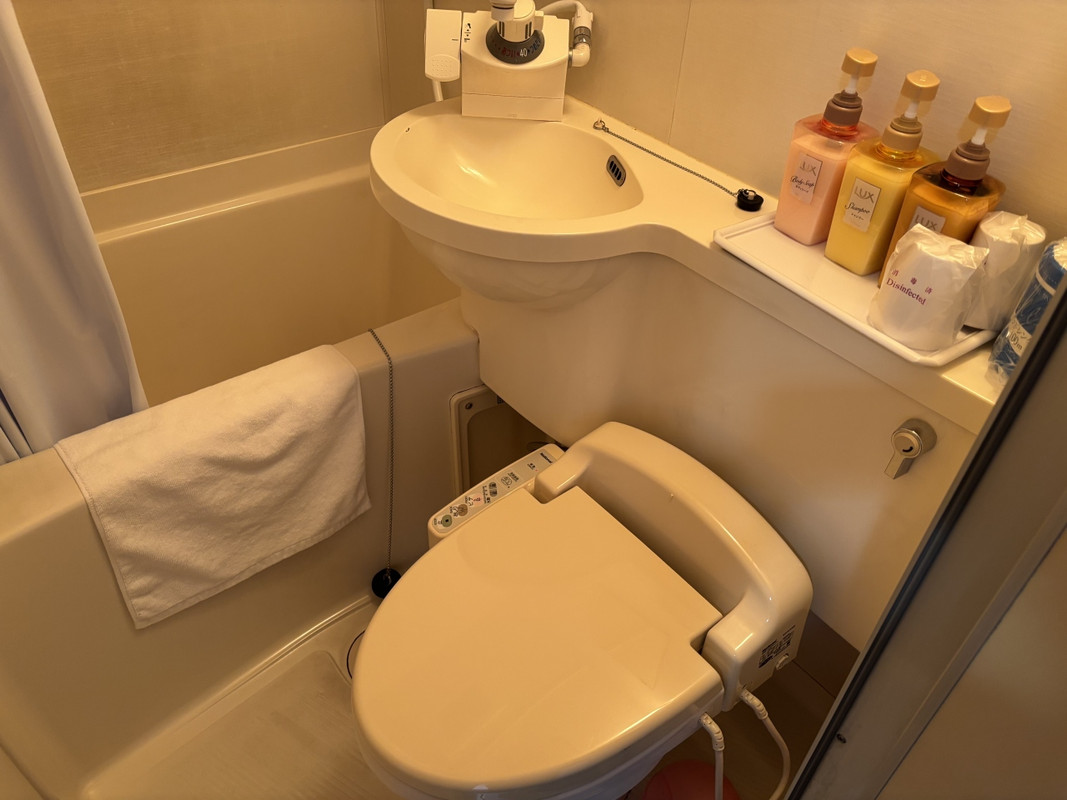 場所は便利なので、泊まれればいいという人にはコスパがよいです。歯ブラシ、カミソリはカウンターにありセルフで取りますが、ヘアブラシはありませんでした。バスユニットはかなり狭めで、トイレットペーパーのホルダーが扉についていました。