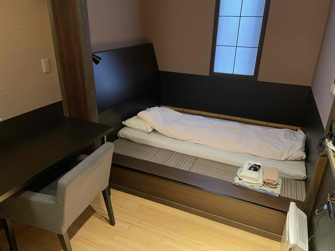8平方メートルという、部屋にトイレすらないプランを予約し、どれだけ狭いのか期待と不安で入ってみるも、思ってたより広く感じます。作り方が上手なのかな。部屋でくつろぐことも出来ますが、広々とした共有スペースもあります。