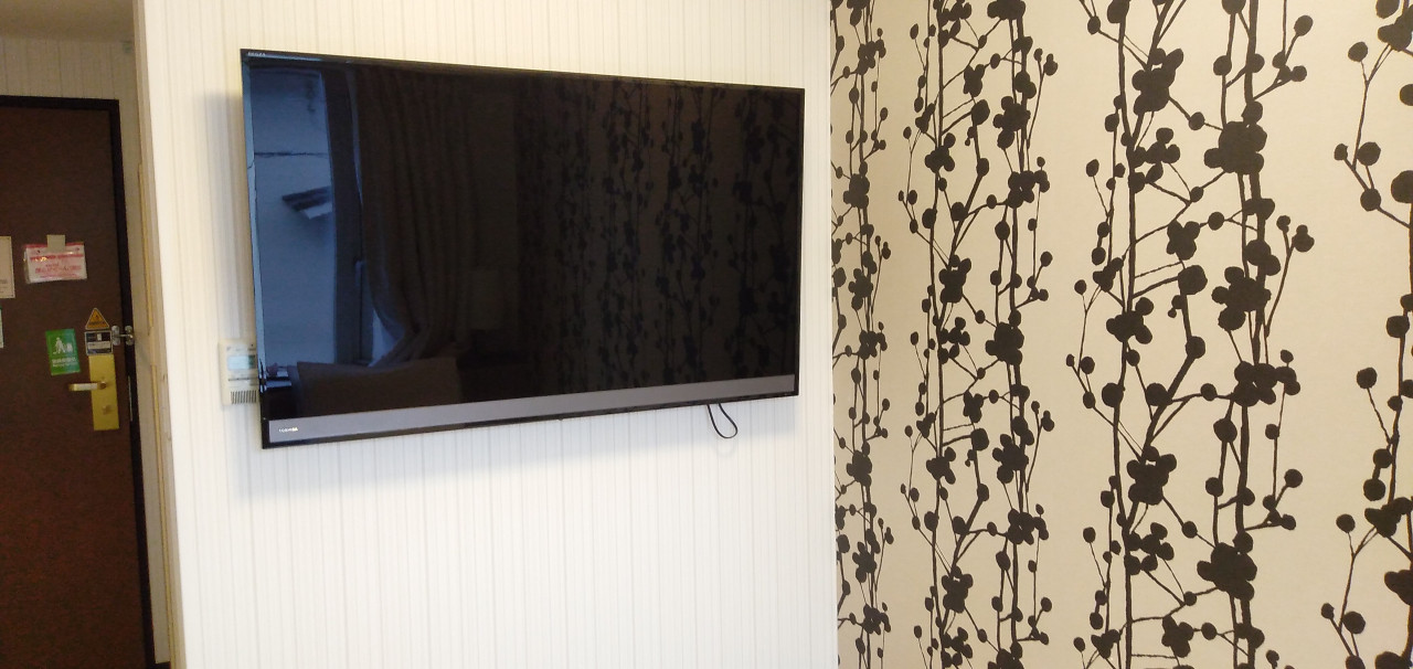 客室は狭いが綺麗、テレビが大きく、無料で映画が見放題。