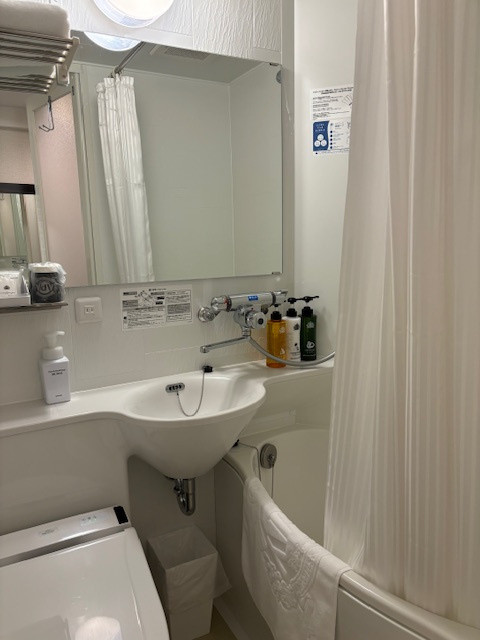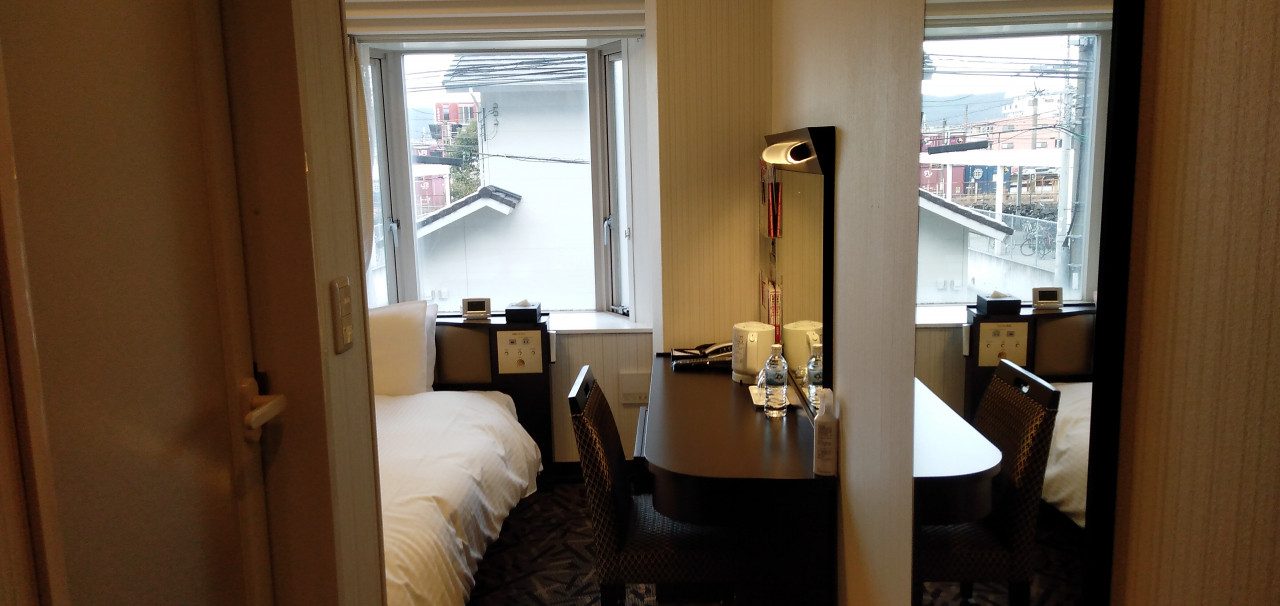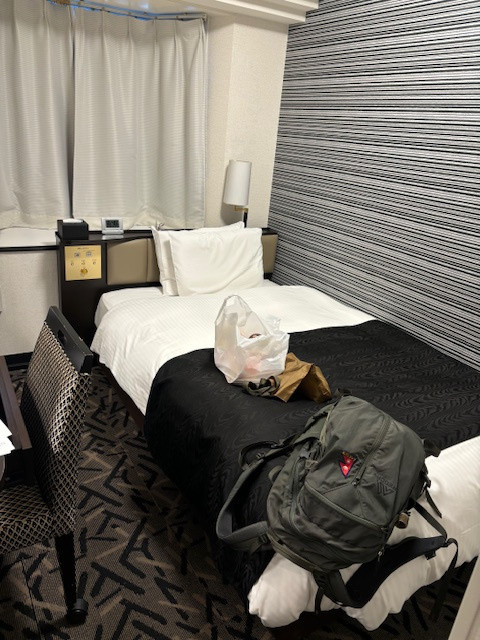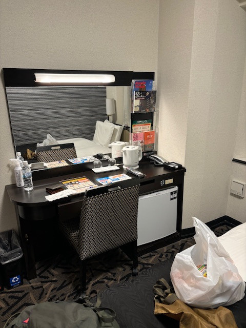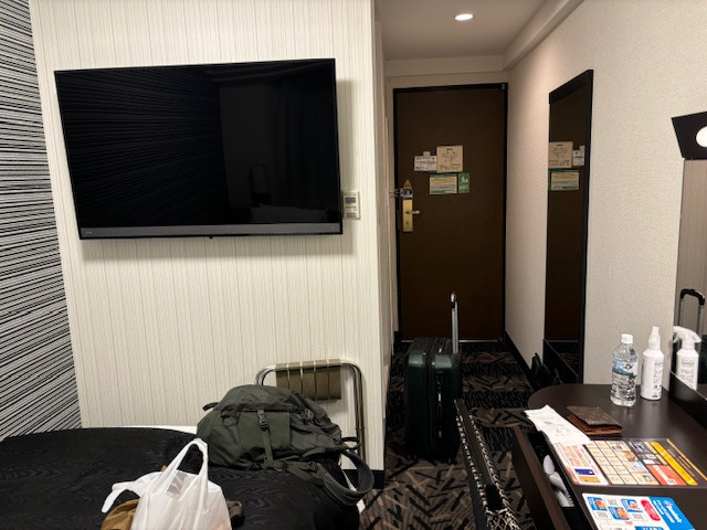 ベッドが隅に寄せてあるお陰で、ミニテーブルと椅子があっても中型スーツケース2個を広げるスペースが確保でき、コンセントはデスク×2・ベッド×2・壁面にも複数あるので便利でしたが、USBポートは無かったです。