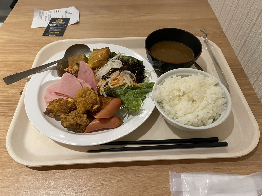 こちらの朝食会場はあまり広くなく机の間隔もちょっと狭く感じたので混まない早めの時間に行くのがいいかもしれません。バイキングにはチキン南蛮もありましたがよくある唐揚げみたいな感じでもありました。とはいえカレーなどもあってメニューを多彩にしようと頑張っているようなのでなるべく多くの種類を盛り付けて多めになってしまいましたが満足はできました。