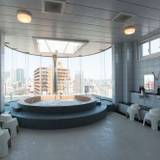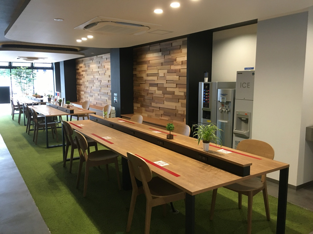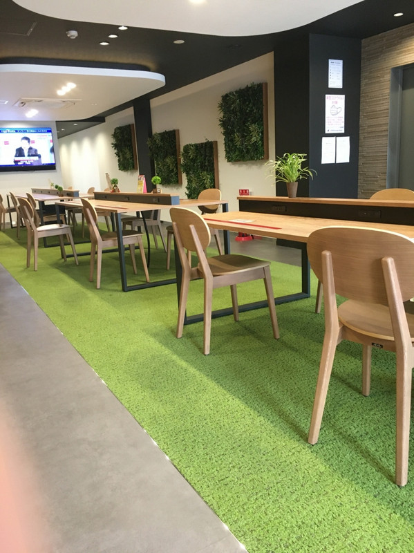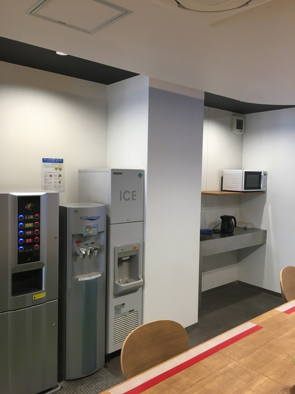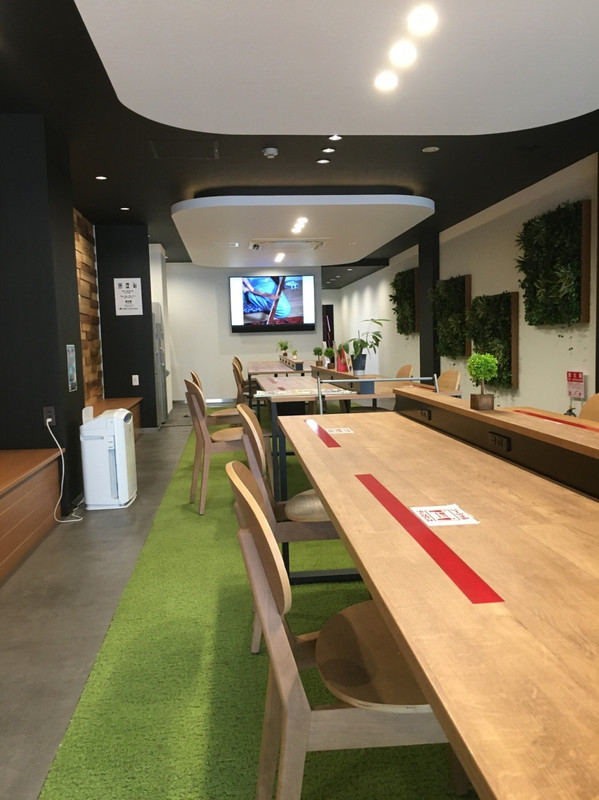 1階には長い卓があって各席には電源コンセントがあり、コーヒーや水等の飲み物を自由に飲むことが出来ます。係の人が頻繁に掃除をして清潔感が保たれていました。最上階の11階には展望風呂があり丸い湯船でした。部屋は和室3畳でしたがテレビ、冷蔵庫、エアコン完売で綺麗でしたが駅の横にあるので常に電車の音が聞こえます。