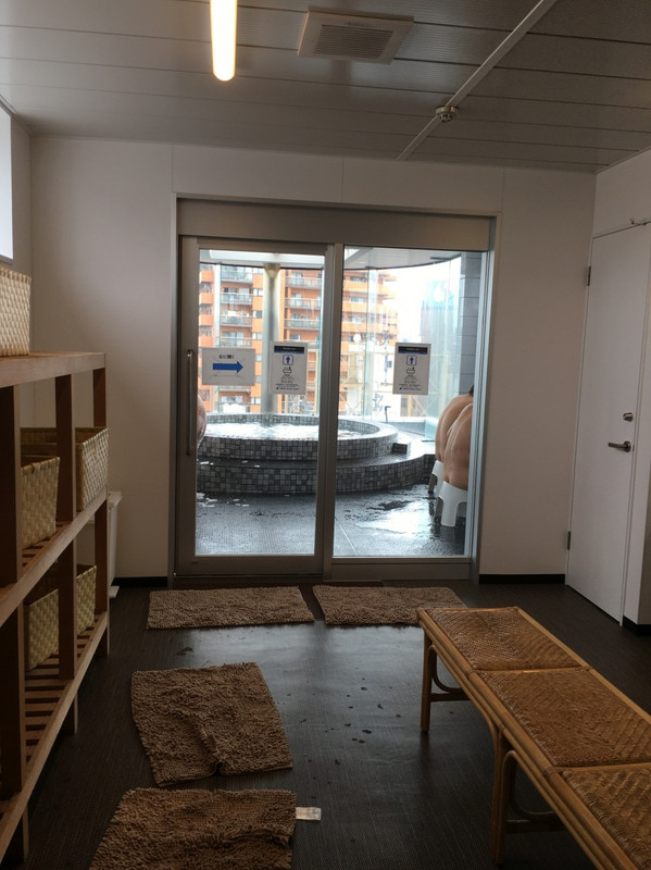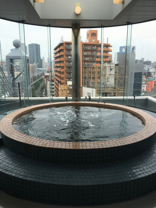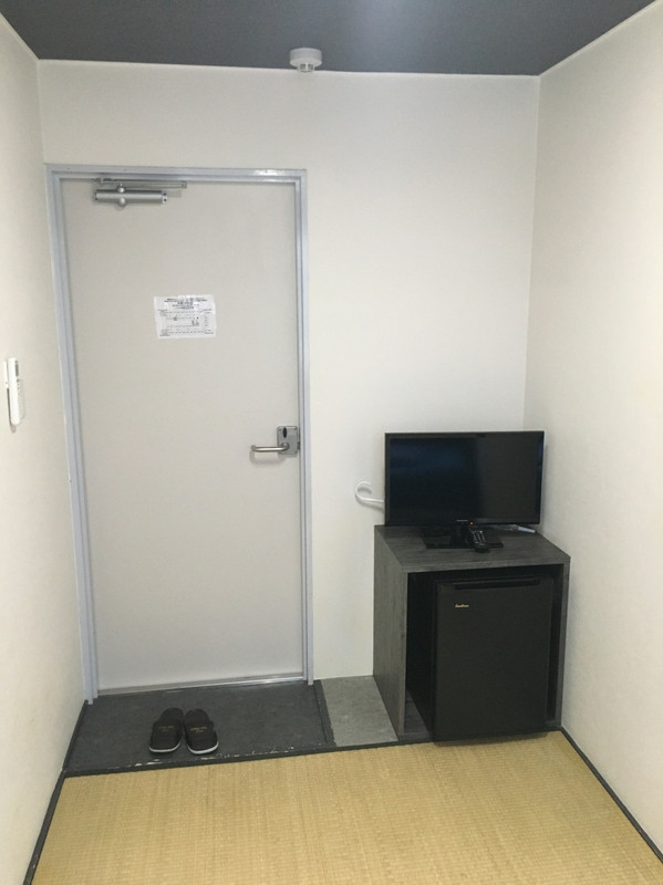 フロント横には、縦長の談話室があり各椅子にはコンセントもあって、コーヒーや麦茶等の飲み物もセルフサービスで飲むことが出来ます。電子レンジもありました。部屋は3畳の和室でテレビ、冷蔵庫、エアコン完備ですが寝巻きはないです。タオルと歯ブラシはチェックインの時に受け取りました。11階には展望風呂があり周辺のビル群を眺めながら入りました。新今宮駅から徒歩1分のところにあるため、絶えず電車の音が聞こえました。
