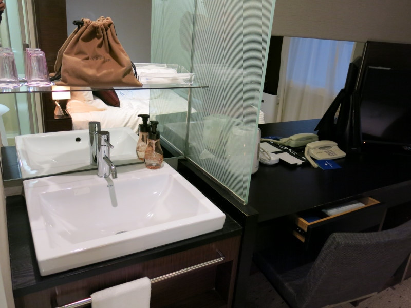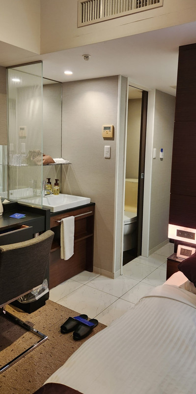 このレベルのビジホにしては珍しく、トイレが風呂と別なのは嬉しいのですが、元々がクローゼット?だった場所を改造したのか、スペースはミニマム。扉を閉めて用を足すのが困難なレベルです。シングルユースなのでドア開放で問題ありませんでしたが、同行者いたら嫌かも。