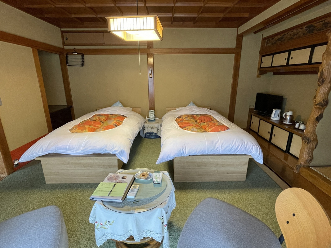 秘湯好きの友人と行きました。直前に読んだ温泉の本にここのすき焼きとお風呂が良いと紹介があって早速予約。夕食もすき焼きを指定。お部屋はトイレや洗面所はありません。でもベッドと二間続きの広いお部屋でした。夕食のすき焼きは普通でちょっとがっかり。宿のスタッフの方達はとても忙しそうで、せっかくの温泉宿、もう少しにこやかな対応があったらなあと残念でした。