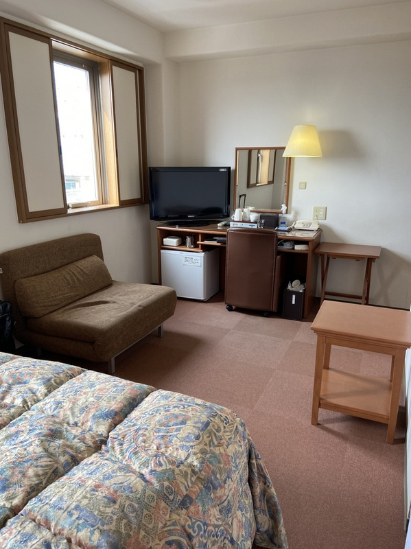 ツインルームを予約しましたが、部屋の広さが分からず少し不安でした。しかし、部屋に入ってびっくりです。ダブルベット2台にソファ付きで広々していて使いやすい。部屋からは磐田駅のホームも見えます。トイレ&浴室の段差が高いので気をつけた方がいいです。女性用アメニティがエレベーター前にあるのは良かった。思いがけず、夜カレーのサービスがあったのは嬉しい。ワンドリンクサービスで生ビール等もあり、部屋へ持ち帰ることもできます。磐田駅が目の前にありますが、音は気になりませんでした。エアコンは風量調節だけでした。部屋の照明が暗すぎるのが残念でした。朝食は品数もあり美味しいです。ただ会場が狭く、相席になったりするのは不安でした。少し遅い時間の方が空いているかもしれません。