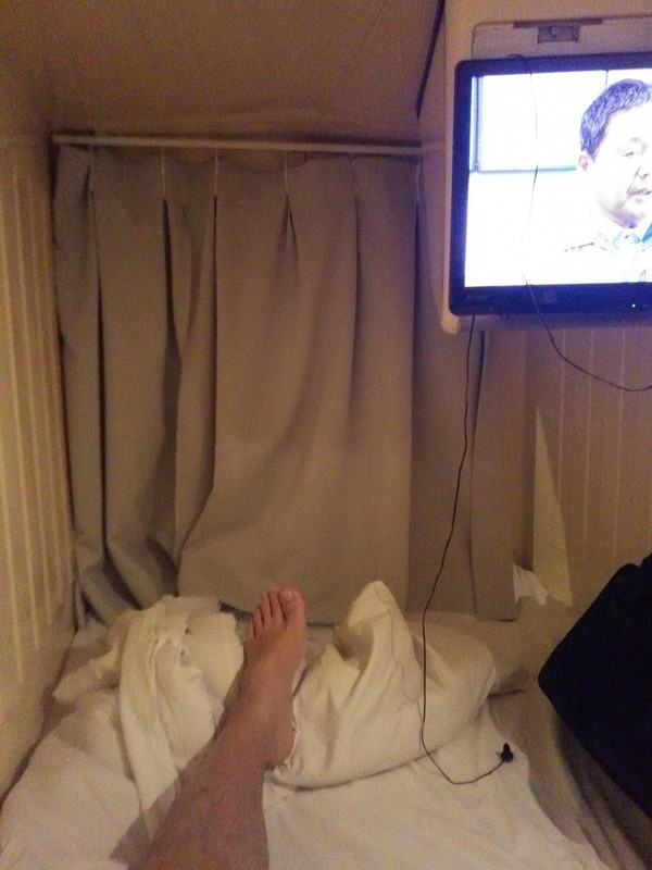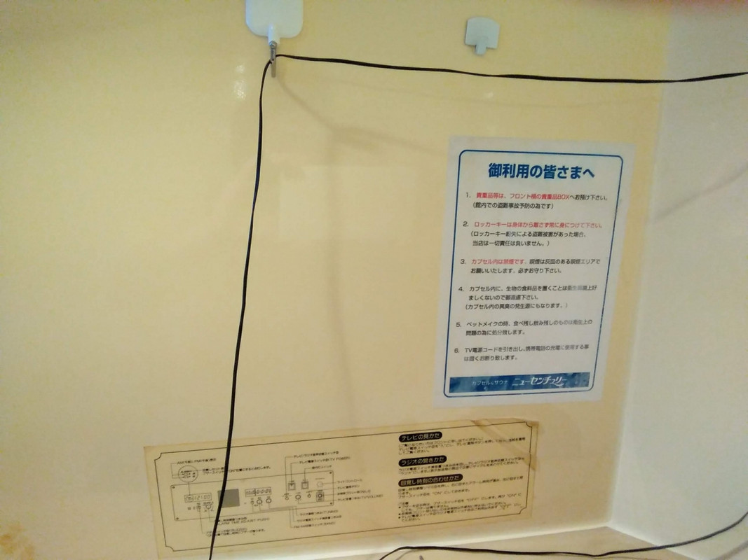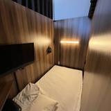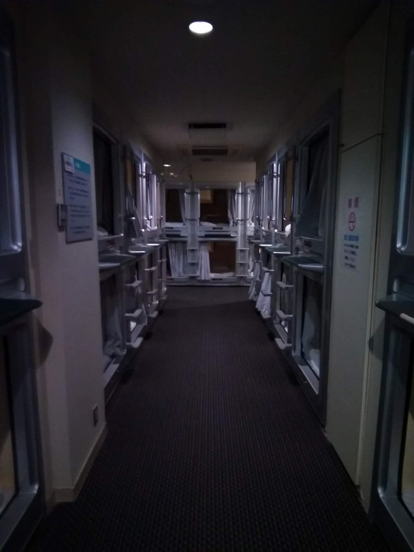 カプセルホテルと思いきや、部屋をパーティションで仕切った部屋でした。むしろ、鍵も内側からかかるし、天井が高いため、部屋の中で立って着替えが出来て便利な面もありました。これで、消防が良く通って宿泊施設で認定されているなあという感じでした。サウナがあり古いけれど快適でした。