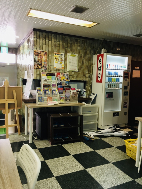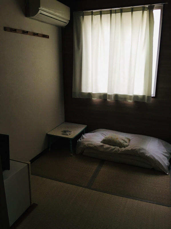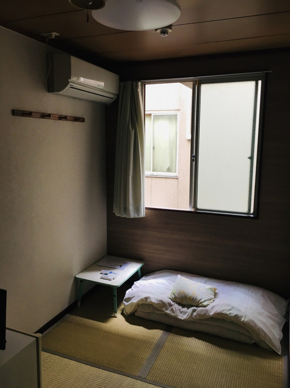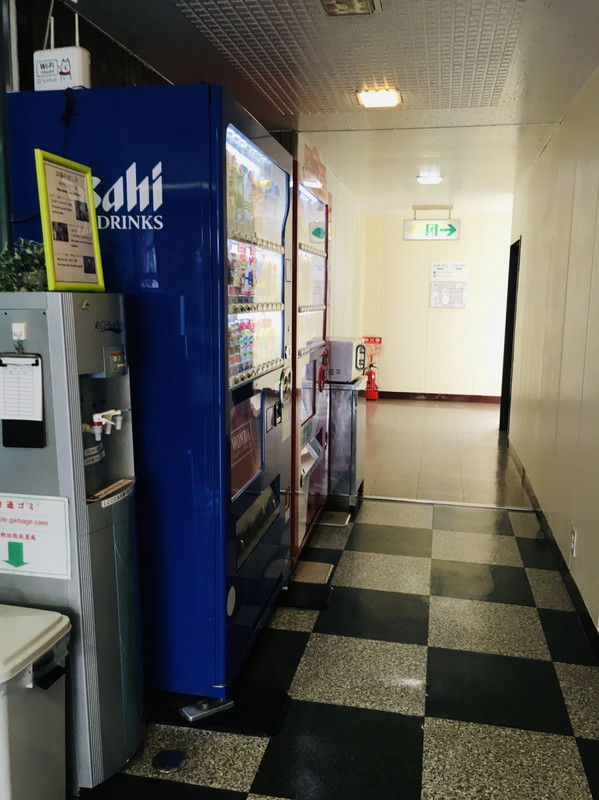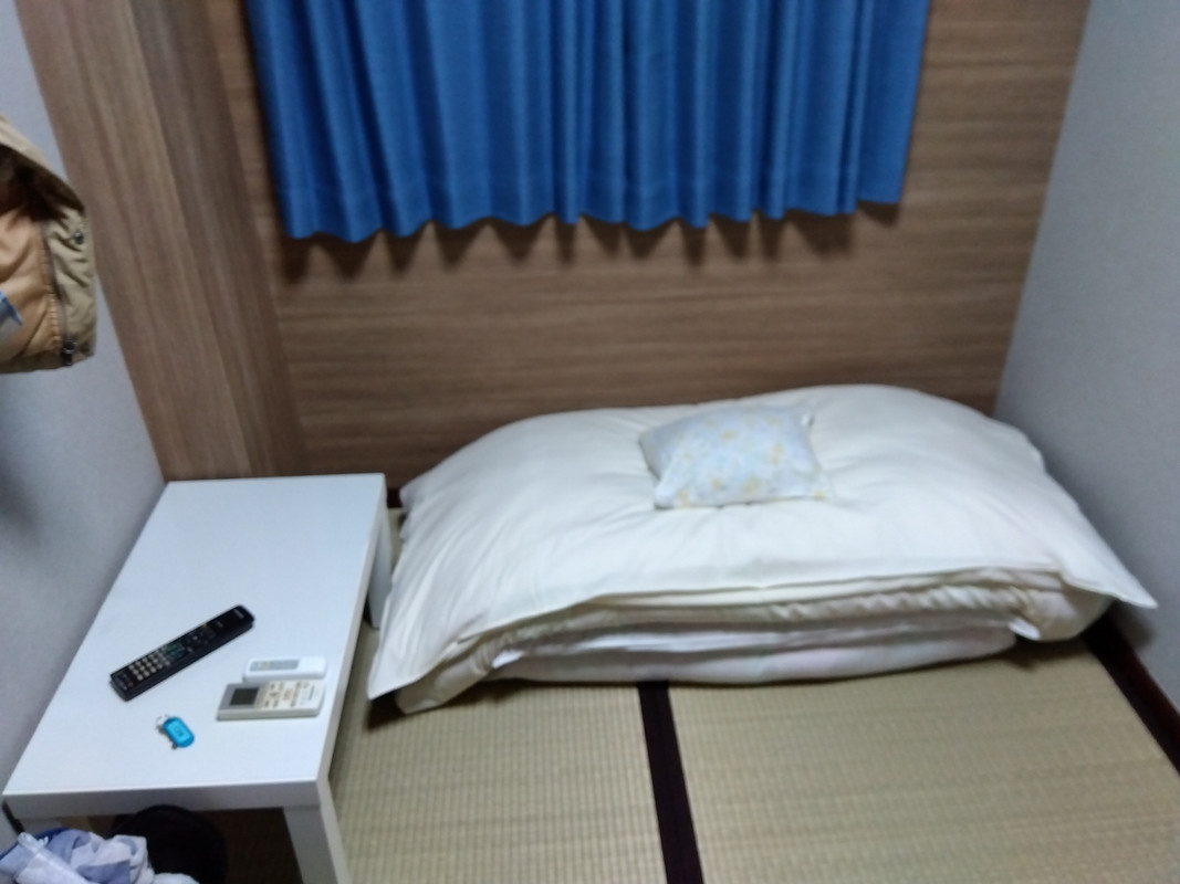 部屋は畳部屋の狭い部屋でミニテーブルと布団が置いてある寝るだけのような部屋で、ミニ冷蔵庫、ミニテレビ、エアコン装備です。1階には浴室、シャワー室、飲み物の販売機、洗濯機があり洗濯機は200円でした。ウォーターサーバが無料で飲めるのも良いです。電子レンジもありました。