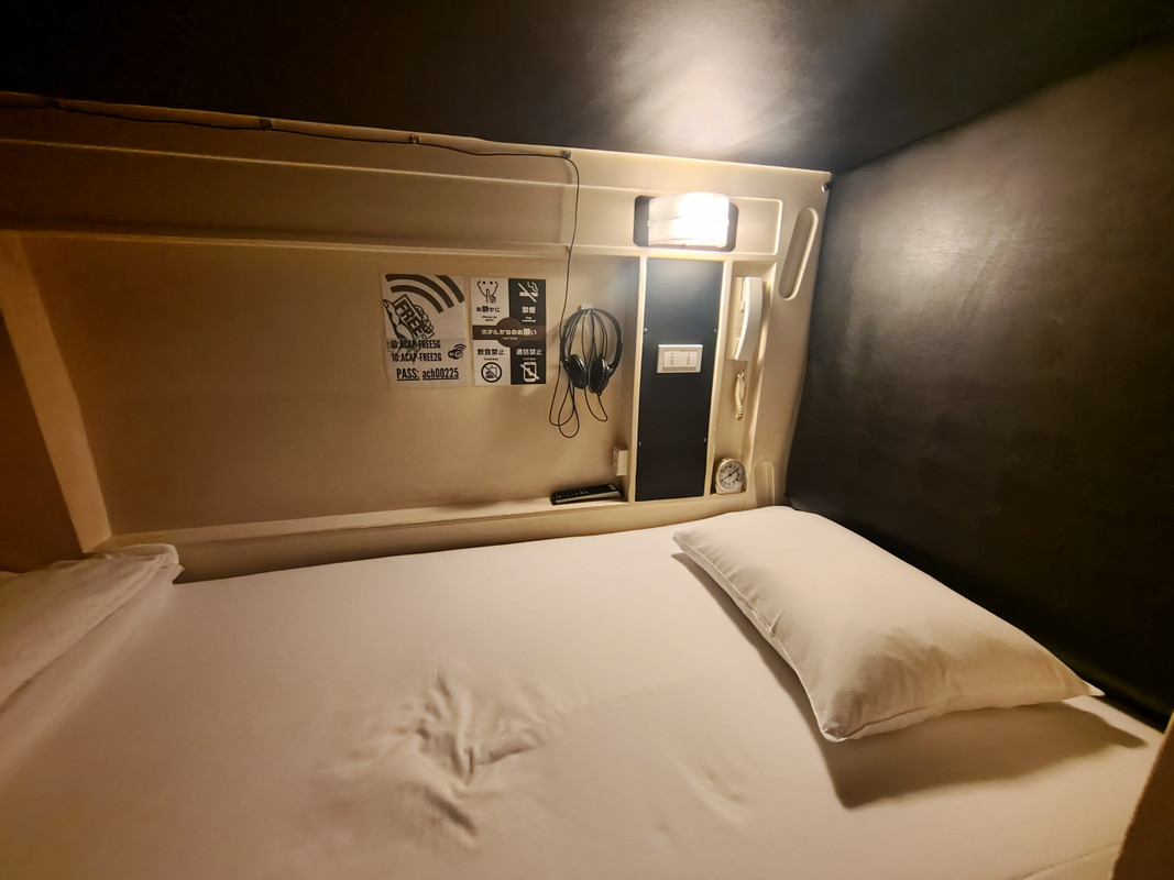 カプセルはテレビ、コンセント付き、夏場の宿泊だったがサーキュレーターがあり、寝苦しさはなかった。