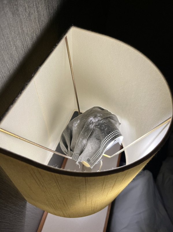 朝、目が覚めたら気づきましたが、ベッドの照明の中に使い古しのマスクがかけられてました。。。1 / 9