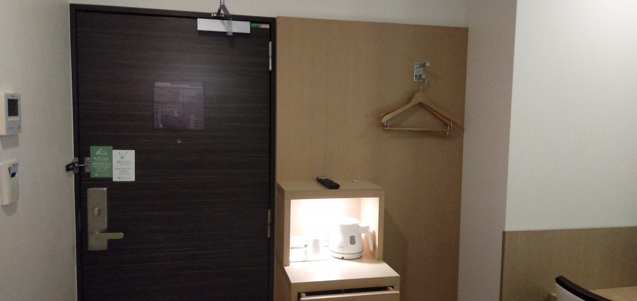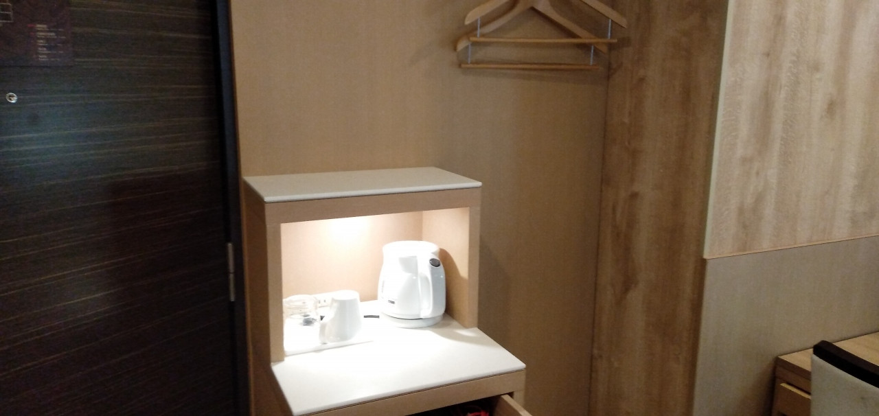 料金もお安めで、客室も標準的です。荷物を置く小さな棚がいくつかあるのと、洋服をかけるところが複数個所あるのは良かったです。機械式の立体駐車場は1.8mの高さ制限があります。貸し傘もあるので急な雨の時には重宝します。