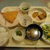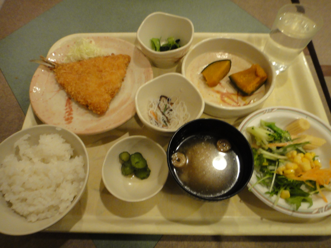 2食付きで食事は食堂でとる。夕食は定食とカレーから選べ、定食を選択。無料なので注文はつけられないが、出来立て、作り立ての料理が提供されるわけではなく、作り置きした冷めたアジフライ、かぼちゃの煮物といったものがトレーで供され給食のようだった。朝食は食べなかった。