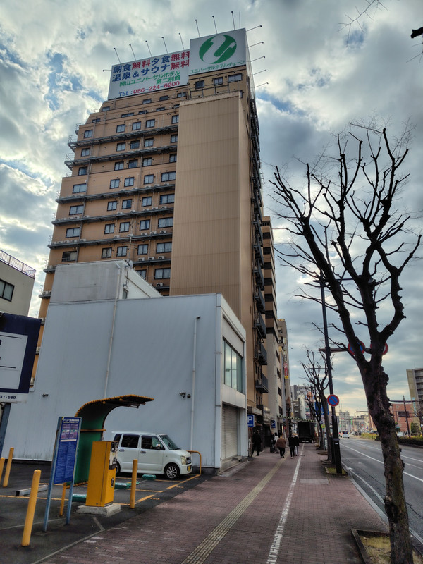 岡山駅からは少し離れたところにあり、路面電車の新西大寺町筋電停か、大雲寺前電停が最寄り。別館と第2別館が並んであるがフロントは同じ。第2別館をあとから建て増ししたようで、不思議な作りで部屋数は多い。