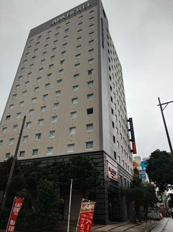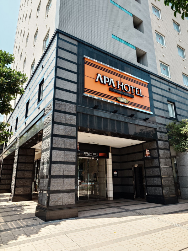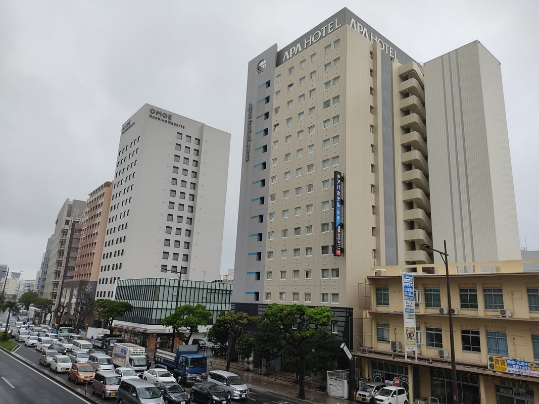 ゆいレール県庁前駅から徒歩5分くらい。久茂地経由のバスが通る沖縄タイムス前停留所から徒歩2分くらいのところにあるアパホテル。国道58号線沿いにあり、松山の繁華街にも近く、国際通りも徒歩圏内。コンビニも目の前にセブンとファミマがあって、少し歩けばマックスバリューもあるなど、利便性は高い。