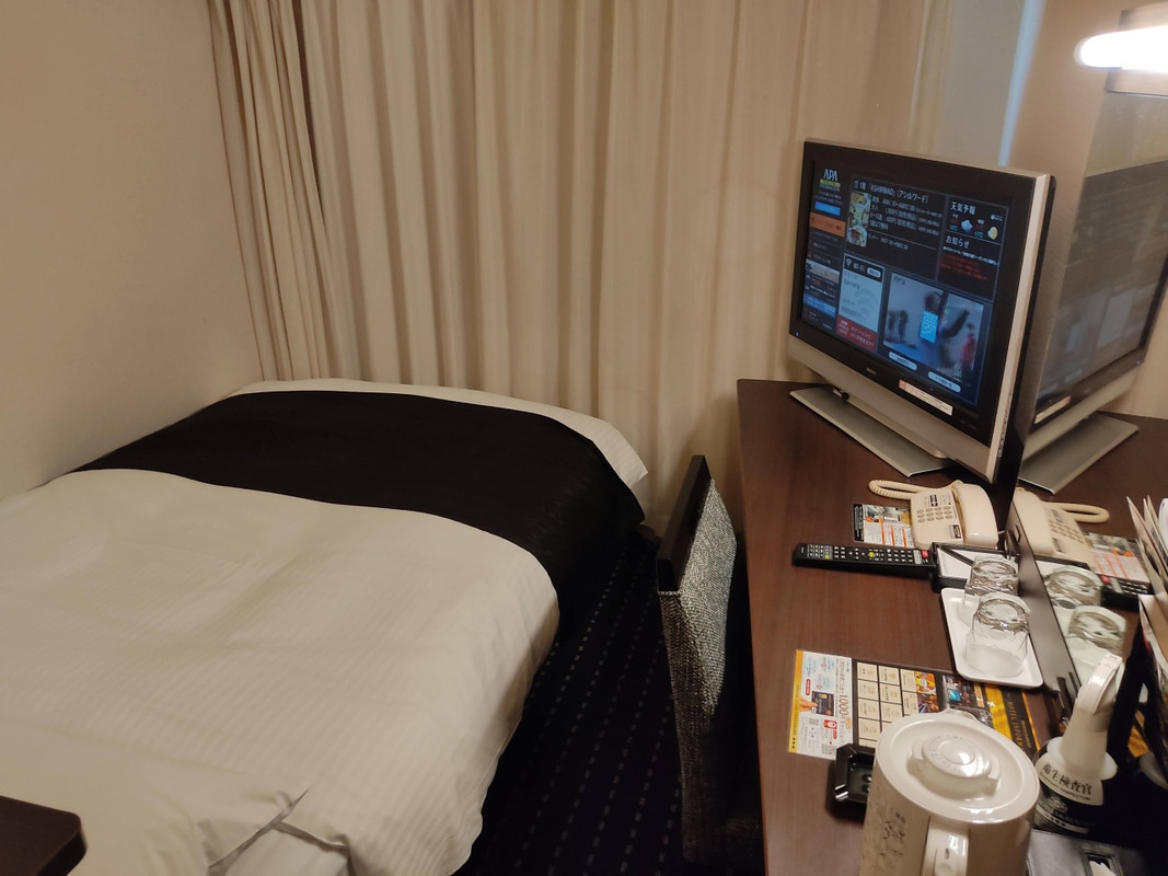 部屋はアパホテル標準的なもので、窓はあるが全く眺望のない部屋も多く、机と椅子はあるが椅子に座ることがなかなか難しい配置であったりする。テレビがやたら大きく、水回りも小さめ。2階に大浴場があるのでよいが、シャワーの壁掛けがないブース(壊れたので撤去したのだと思う)が多数だったりと、他のホテルではなかなかないところもある。基本、寝ることがメインで、観光の拠点、ビジネス利用であれば良いかと。ただ、部屋の掃除が徹底されておらず、前の方の飲み物が捨てて無かった(サンダルを入れるところにあったので分かりにくいが)のはかなりのマイナス。しっかりとした掃除をお願いしたい。1 / 4