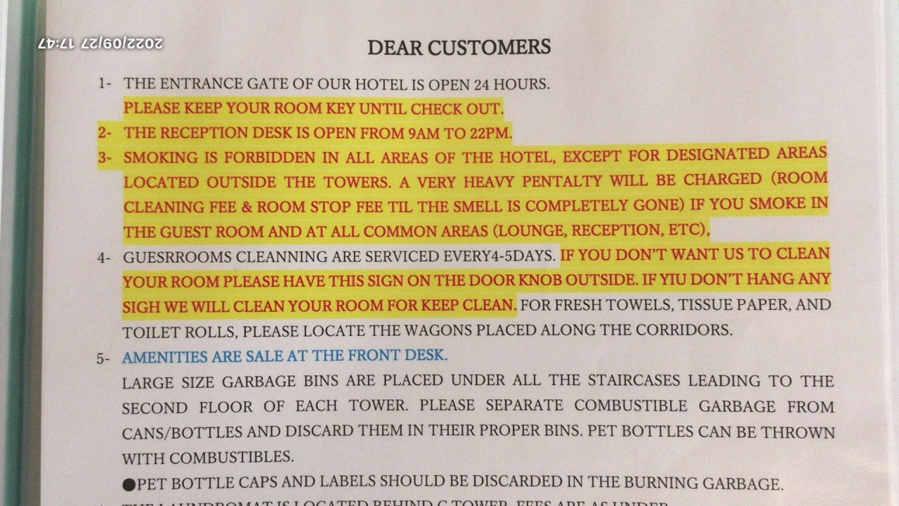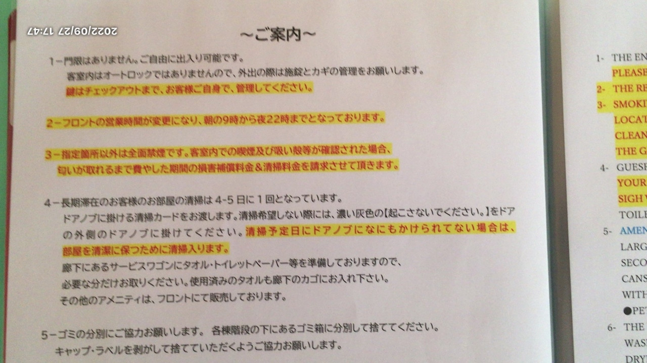 - 日本の厚生労働省は、インやホテル、モーテルなどを含むいかなる種類の宿泊施設でも、日本に居住してない海外のお客様の宿泊に際し、国籍および旅券番号の確認とパスポートのご提示を義務付けております。また、各宿泊施設には、ご宿泊者全員のパスポートをコピーし保存する義務が課せられておりますので、ご協力をお願いいたします。