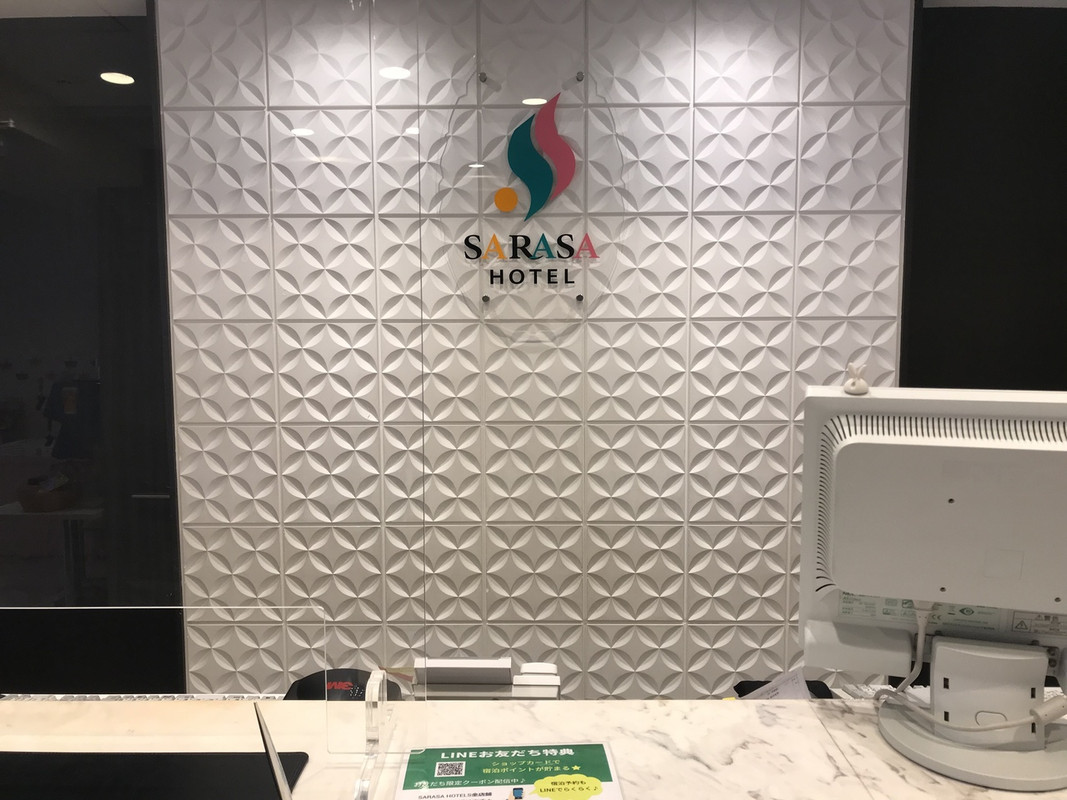 カラフルなロゴマークの看板がお出迎え。フロント前ではコーヒーなどのソフトドリンクがいただけます。暑い時期にアイスコーヒーは助かりました。