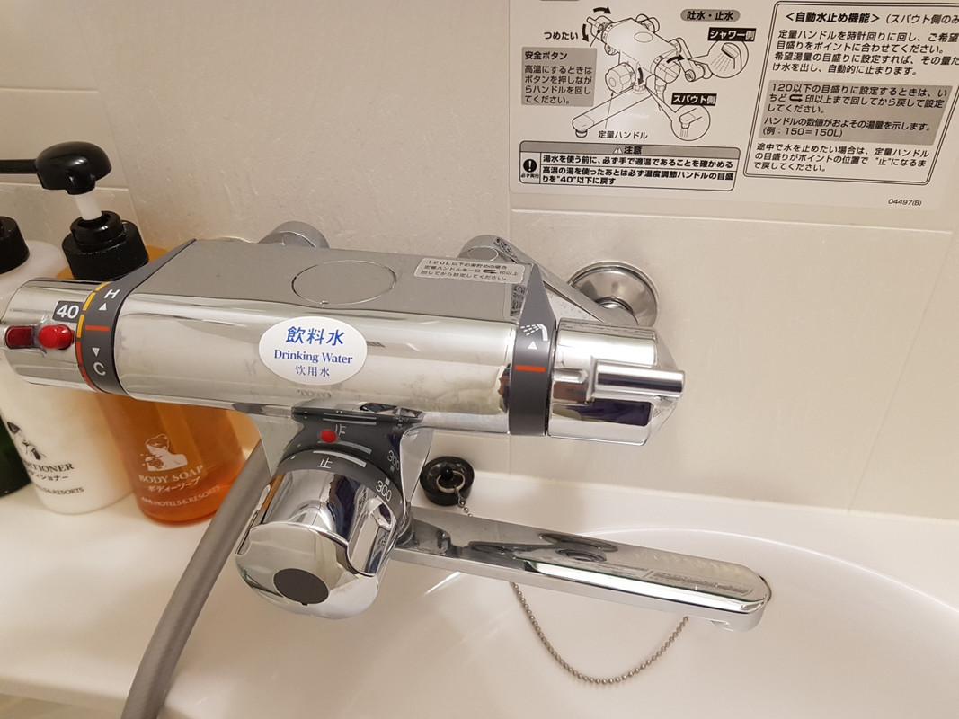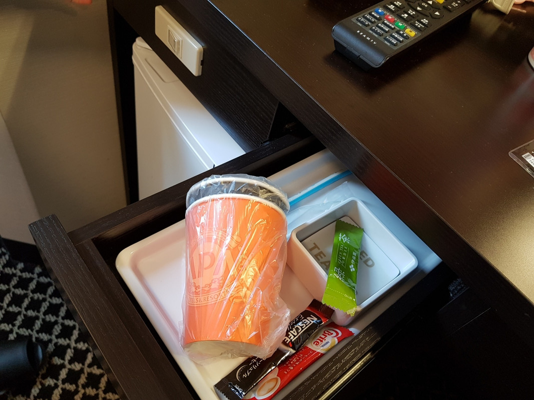湯舟は設定水量で自動的に止まるようにできるらしい。蛇口が反時計回りに開くタイプで慣れるのにやや時間がかかった。洗面所やお茶セットのコップが紙コップになってるのはコロナ対策⁇ ちなみにお茶セットは、スティックの緑茶とコーヒー(クリーマー、シュガー)。