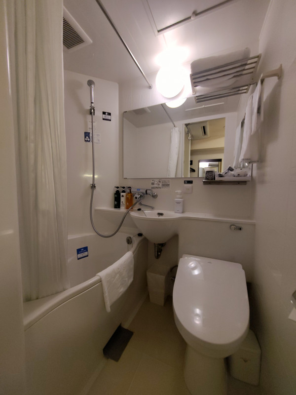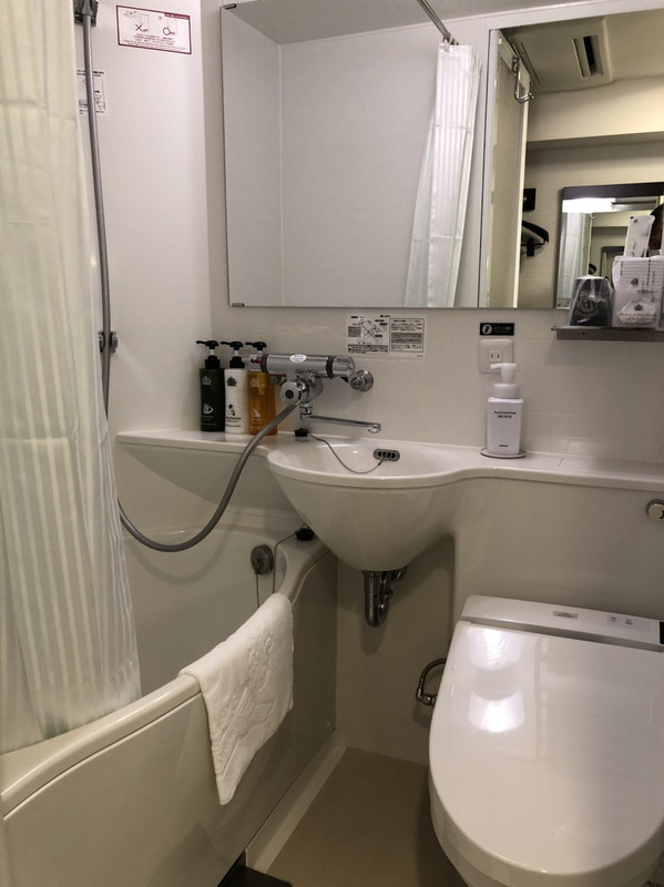 唯一の難点は、近くに飲食店やコンビニがないこと。西口側は飲食店が少なく、閉店時間も早めなので、10分以上歩いて、大きな道路沿いのファミレスを利用した。ホテル内の無人コンビニはアルコールの販売がなく、アルコールの自販機もない。寝酒は2ブロックくらい先のコンビニを利用することになる。1 / 5