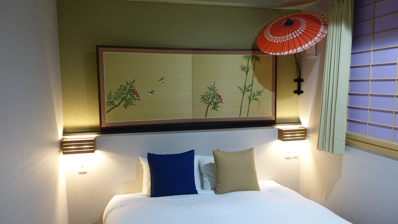 客室は展望はないが古都・京都の文化を感じるエレガントな和の意匠。アメニティは受付横に置かれたものを部屋に持って行く。レストランはないが近くに食事処が多く不便さはない。1 / 5