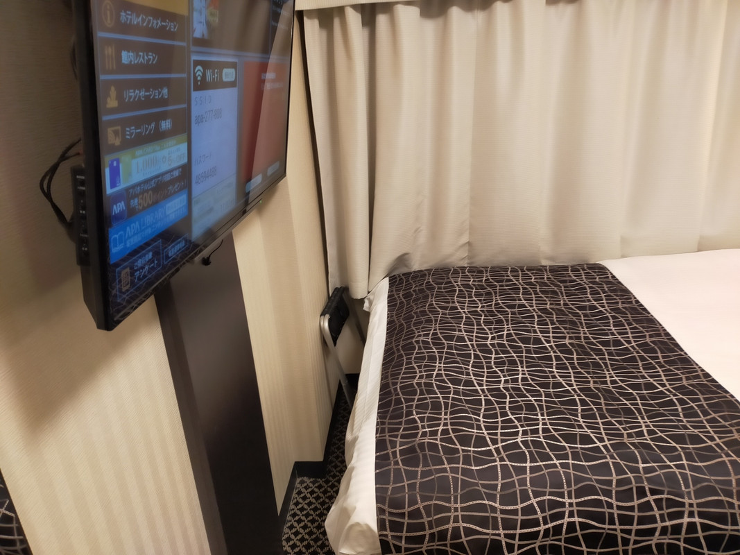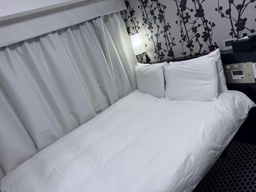 客室は標準的なアパホテルという感じ。コンセントも枕元にある機能的なスタイルです。