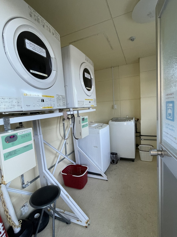 一階に無料で使える洗濯機が2台あり。部屋には小さいですが物干しとレンジがあるのもとても良かった点です。
