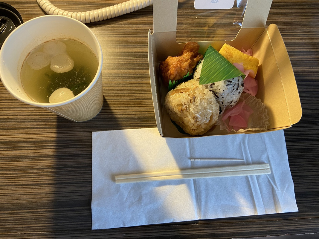 コロナの影響で朝食は、鶏めしかサンドイッチのお弁当セットを朝フロントでいただき、部屋で食べる形に変わっています。