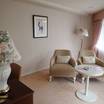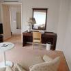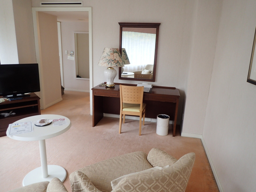 部屋は3階。スタッフが「角部屋ですが少し広い部屋」と言っていたので、41㎡より広いかもしれない。リビングスペースが三角形の変形部屋だが、ベッドとは柱で遮られる形になるので、かえっていいかもしれない。ただし、湖とは反対側なので眺望は良くない。
