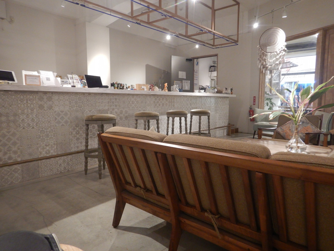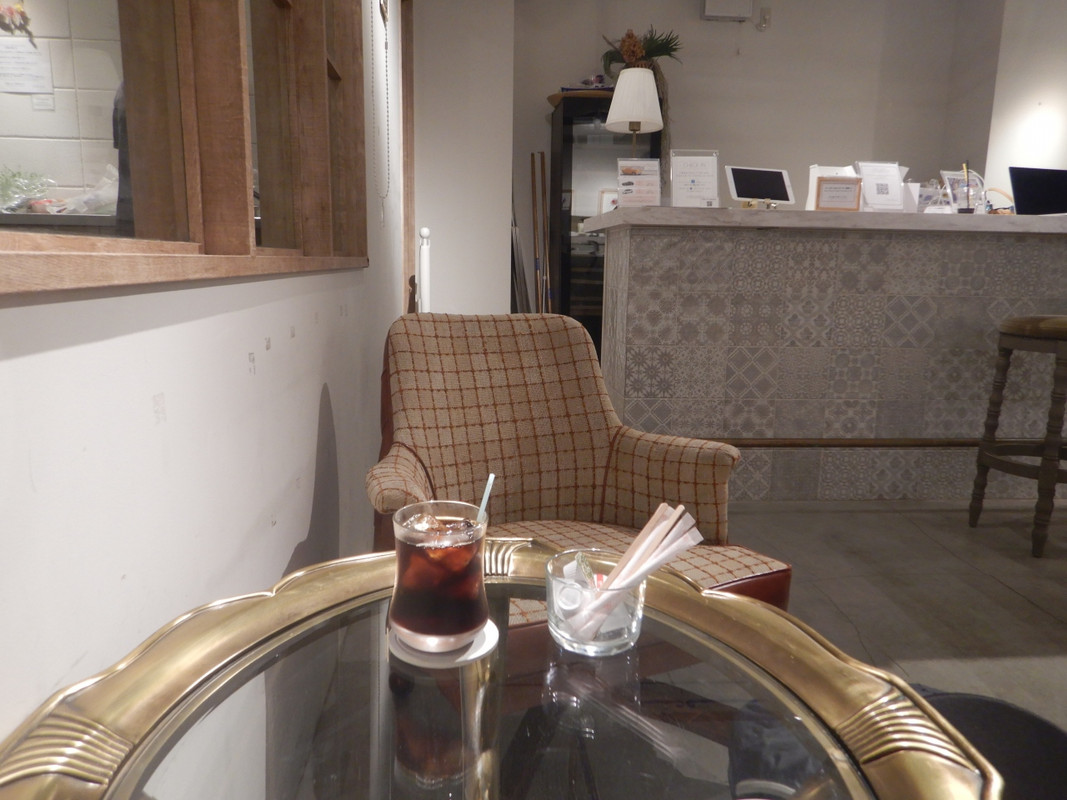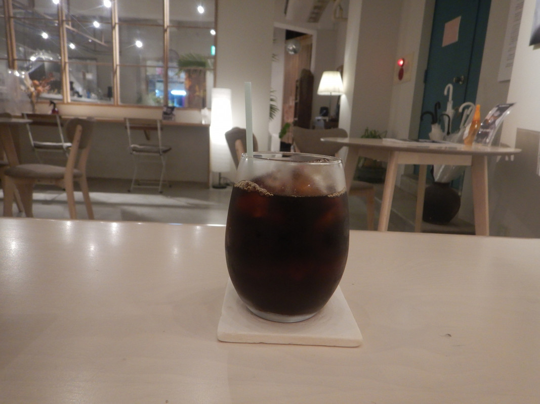 1階のカフェの部分にはコンセントがないので、その奥のゲストハウスの一部のようなターブルを利用した。この時はアイスコーヒーは350円だったが、現在は400円になっている。1 / 2
