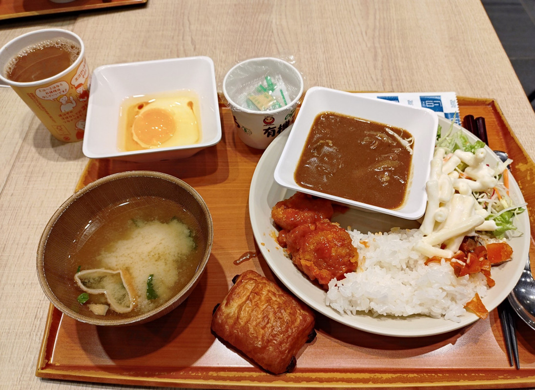 朝食の地元グルメは、海軍カレーと赤岩高原卵でした。1 / 2