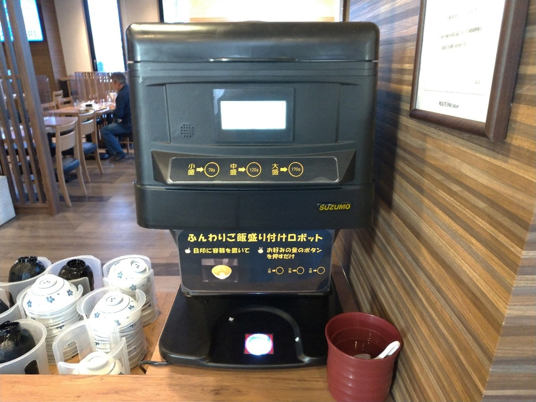 朝食バイキングのご飯がロボットになっていました。量を選択してボタンを押すと、用意した茶碗の中にご飯が落ちてきます。コロナ禍の関係で導入されたのでしょう。他のルートインもそうなのか気になりました。1 / 4