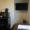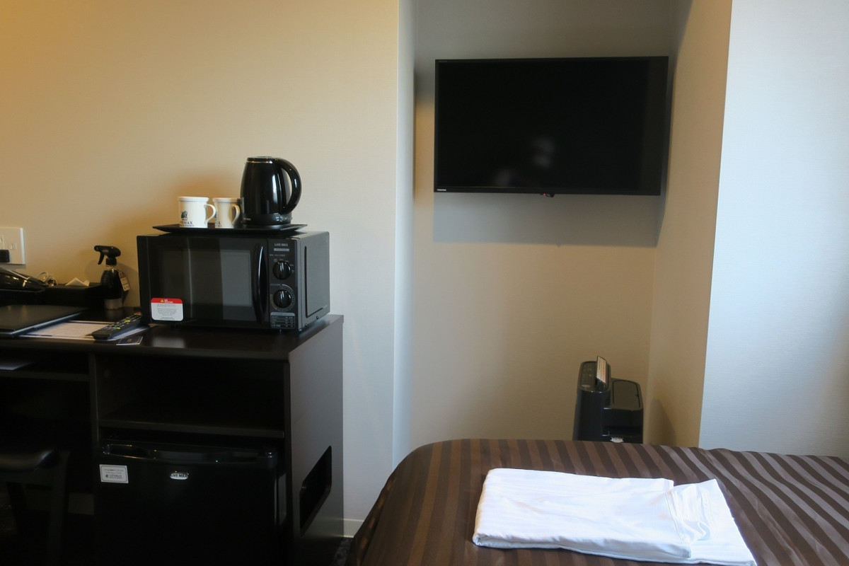 このホテルが売りにしているように、室内に電子レンジがありました。やはり、あると便利。電子レンジ、冷蔵庫、湯沸かしポットなど室内の家電類にホテルのロゴが入っていました。ホテル仕様に製造されている⁈ 延長コードがあるのも、パソコン作業に便利でした。一方、ミネラルウォーターやティーバッグの備品は無し。これはいいけど、クローゼットや荷物置き台が無いのは不便。