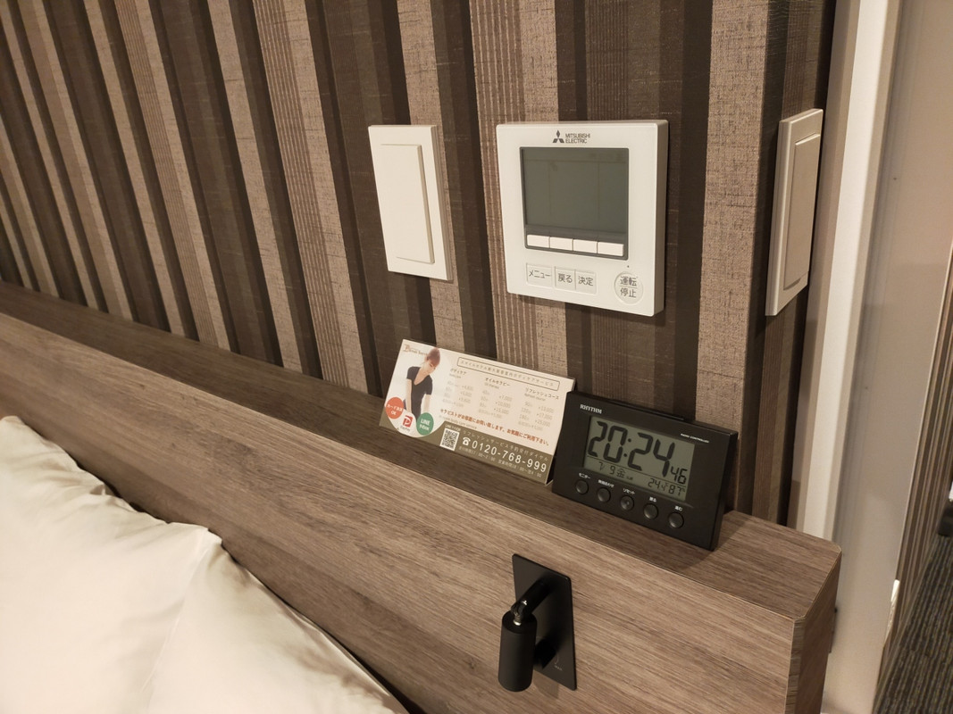 全体的に落ち着いた色合いの部屋で、最近のホテルらしく枕元にコンセントとUSBの充電口があります。