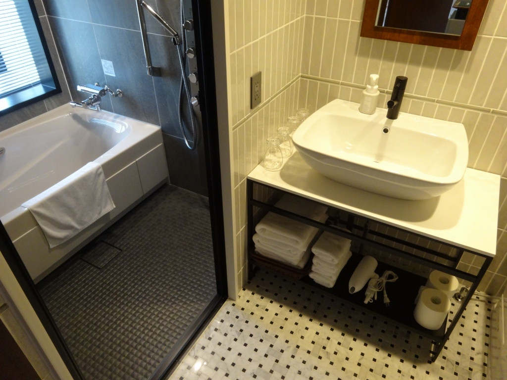 浅草寺の仲見世から1分と歩かない場所にある、浅草の情緒あふれる街中にあるホテルです。デザイナーズホテルを謳うだけあり、調度はスタイリッシュ。浴室には打たせ湯やヘッドシャワーがあり、くつろげました。