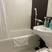 部屋のバスルームはユニットバス。浴室に湯を張る蛇口を動かして洗面台の蛇口として使うので、回す方向を間違うとシャワーが出ます。