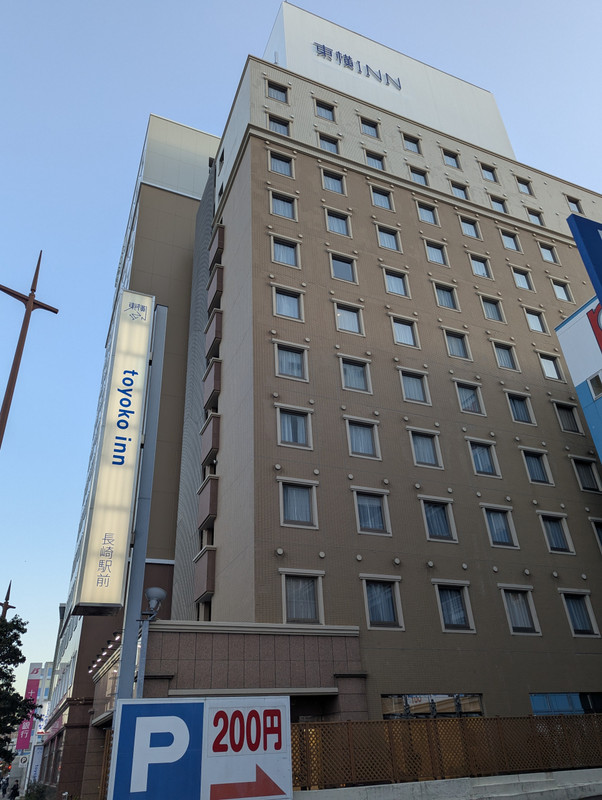 長崎駅からは徒歩で10分、五島町電停なら目の前のロケーション。建物、設備は東横インの標準仕様で、客室は少し狭いが清潔でWi-Fiやアメニティ等も一通り揃っている。朝食会場は広く、ご当地名物皿うどんがあり、また、品数も他の東横インホテルより多かったようだ。