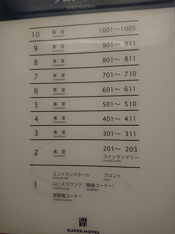 ビジネス利用で宿泊しました。瓦町駅から徒歩5分弱くらいでした。これまでも各地のスーパーホテルに宿泊しましたがこちらのホテルはワンフロアの客室数が10部家とコンパクトで小さめなホテルでした。